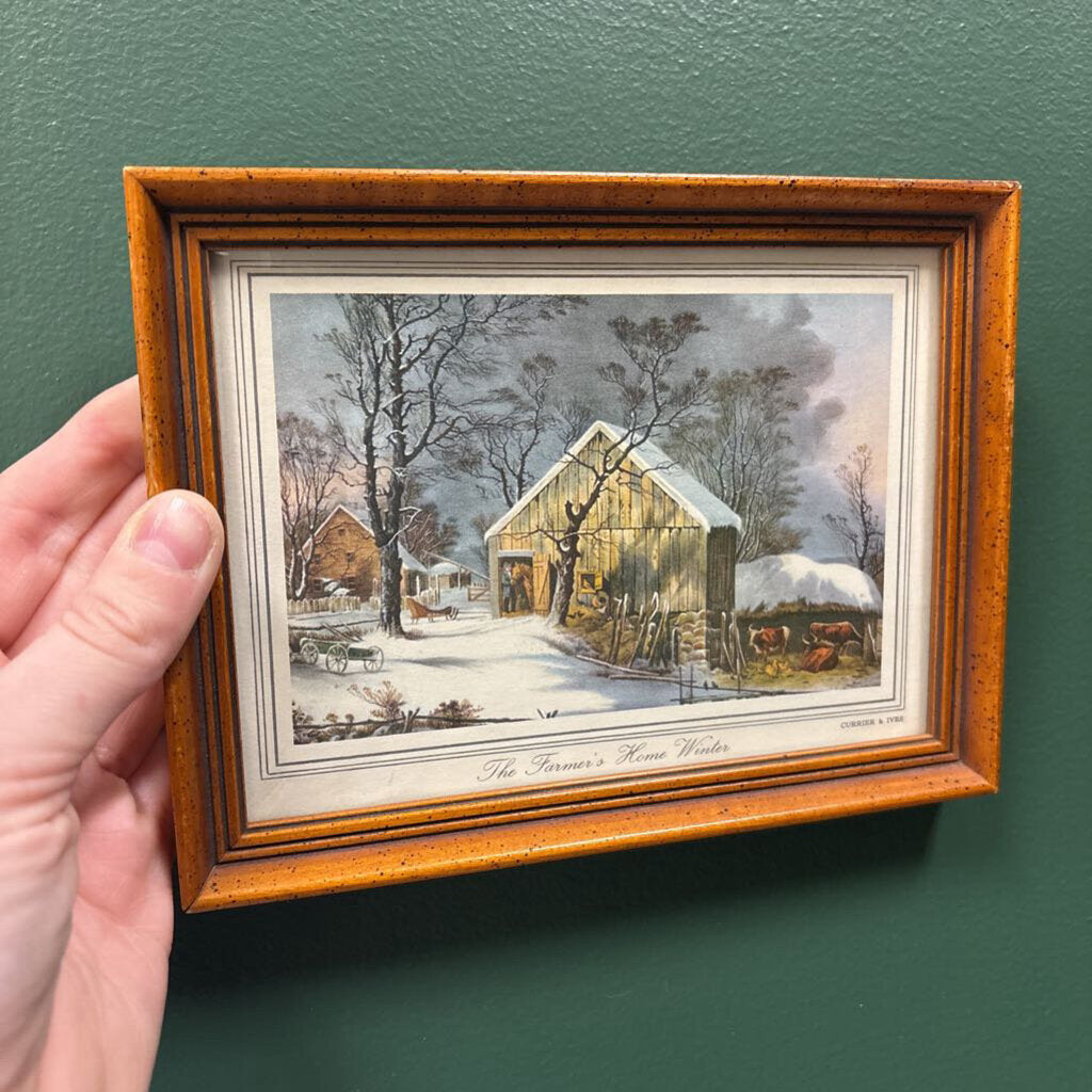Vintage framed Currier & Ives print titled "Getting Ice." This classic winter scene captures 19th-century rural life with beautiful detail and muted tones. Set in a warm wooden frame that complements its nostalgic charm. Approximately 7.25" long by 5.5" tall.