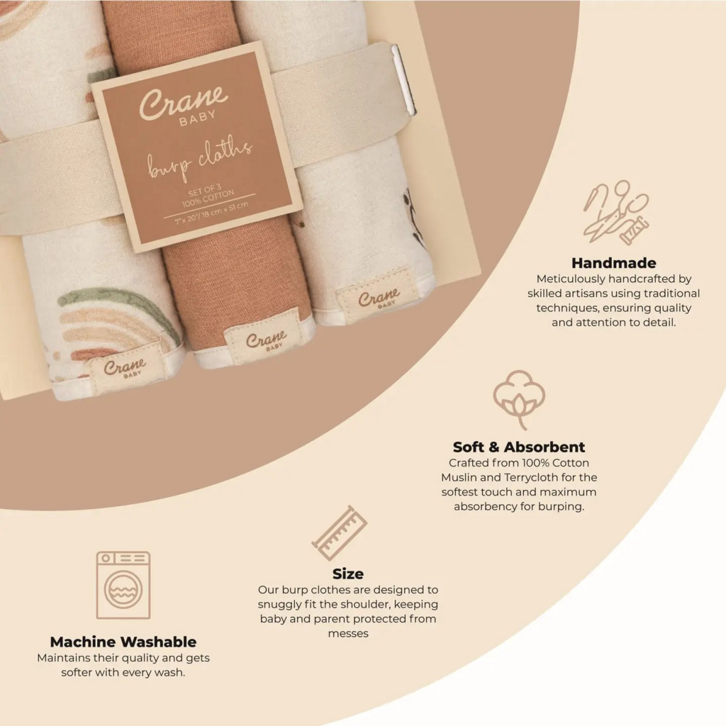 Lightweight and absorbent 100% cotton burp cloths featuring a cotton terry cloth back and cotton muslin front, printed to portray the essence of a watercolor we painted in house. Set includes 3 unique burp cloth designs. Coordinates perfectly with our Crane Baby bibs and muslin swaddle wraps - perfect for gift bundles!