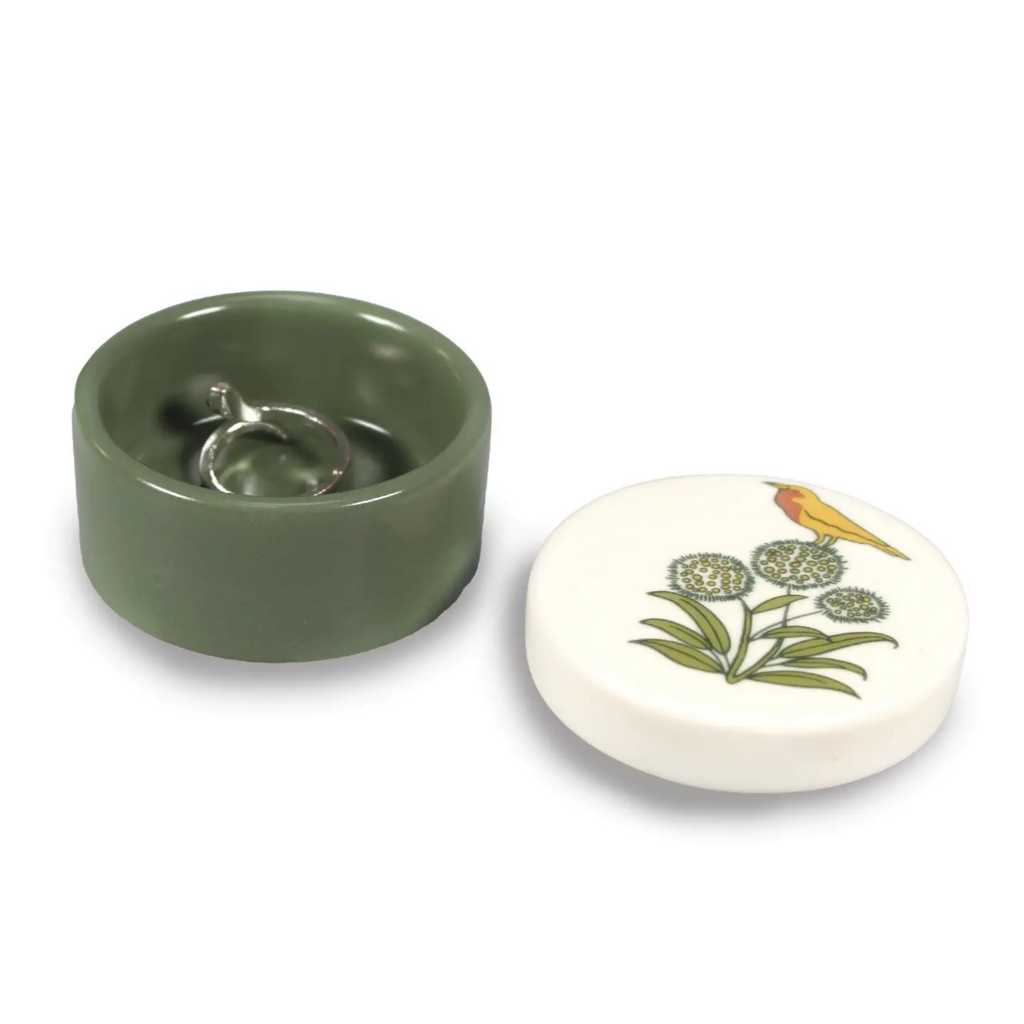 Featuring a delicate bird perched on a leaf, this circular trinket box adds an elegant touch to any space. Store jewelry, accessories, or office supplies in this lavish box. Perfect for a glamorous master bedroom, chic office, or refined living room, this charming piece offers a surprising number of uses throughout the home of office. 6.1 x 3.7 x 3.3 in
