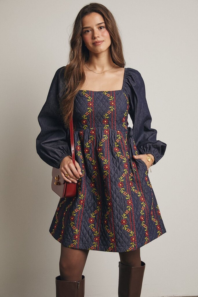 This sage dress is adorned with delicate small embroidered flowers and features charming ruffle detailing. Its soft color and thoughtful accents create a graceful, comfortable look perfect for adding a touch of elegance to your wardrobe.