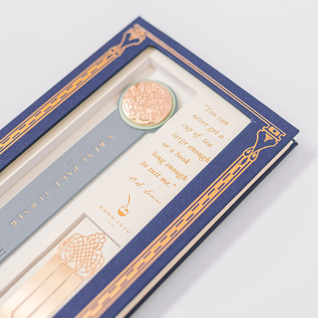 This bookmark set includes 1 gold metal clip bookmark and 1 vegan leather bookmark with gold foil lettering. The vegan leather bookmark reads "Mark My Words". Bookmarks come in a foil-stamped storybook box measuring 4.625" x 7.875"