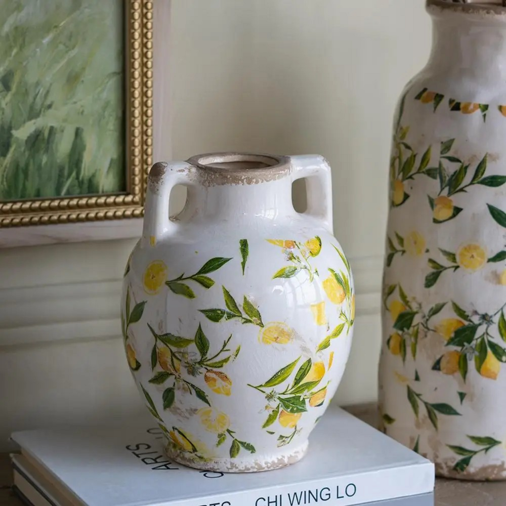 A timeless piece that exudes vintage elegance with a touch of rustic charm. Crafted from smooth ceramic, this vase features a creamy white glaze with a weathered finish, its subtle cracks and imperfections adding an authentic, aged allure. Adorning its surface is a delicate, hand-painted floral pattern in soft sage green, with intricate vines, blooming flowers, and tiny leaves that create a lush, garden-inspired design, evoking the tranquility of a countryside meadow. The vase’s classic, cylindrical shape and slightly chipped rim enhance its old-world appeal, making it a perfect vessel for fresh blooms like white peonies or as a decorative accent in a farmhouse living room, cozy dining room, or vintage-inspired display. 11.6 x 6.5 x 6.5 in