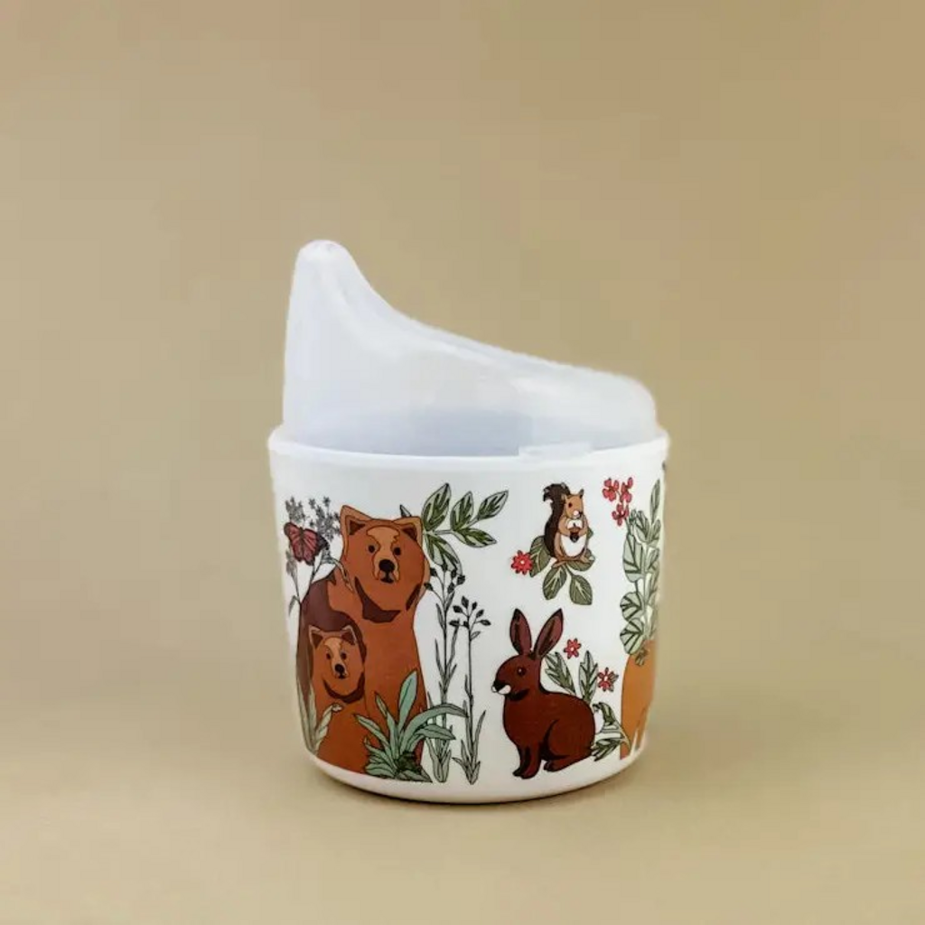 Native Georgia plants surround a fox, deer, and a rabbit. Thistles, strawberries, peaches, ginkgo leaves and sweet honey bees are featured. The sippy cup has a removable clear top that can be set aside when it is time to transition to a toddler mug. We are very proud of this easy to clean melamine mug.