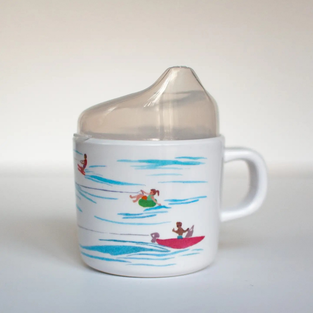 Vintage feeling strawberries plants sweetly wrap around this sippy mug. It has a removable clear top that can be set aside when it is time to transition to a toddler mug. We are very proud of this easy to clean melamine mug.