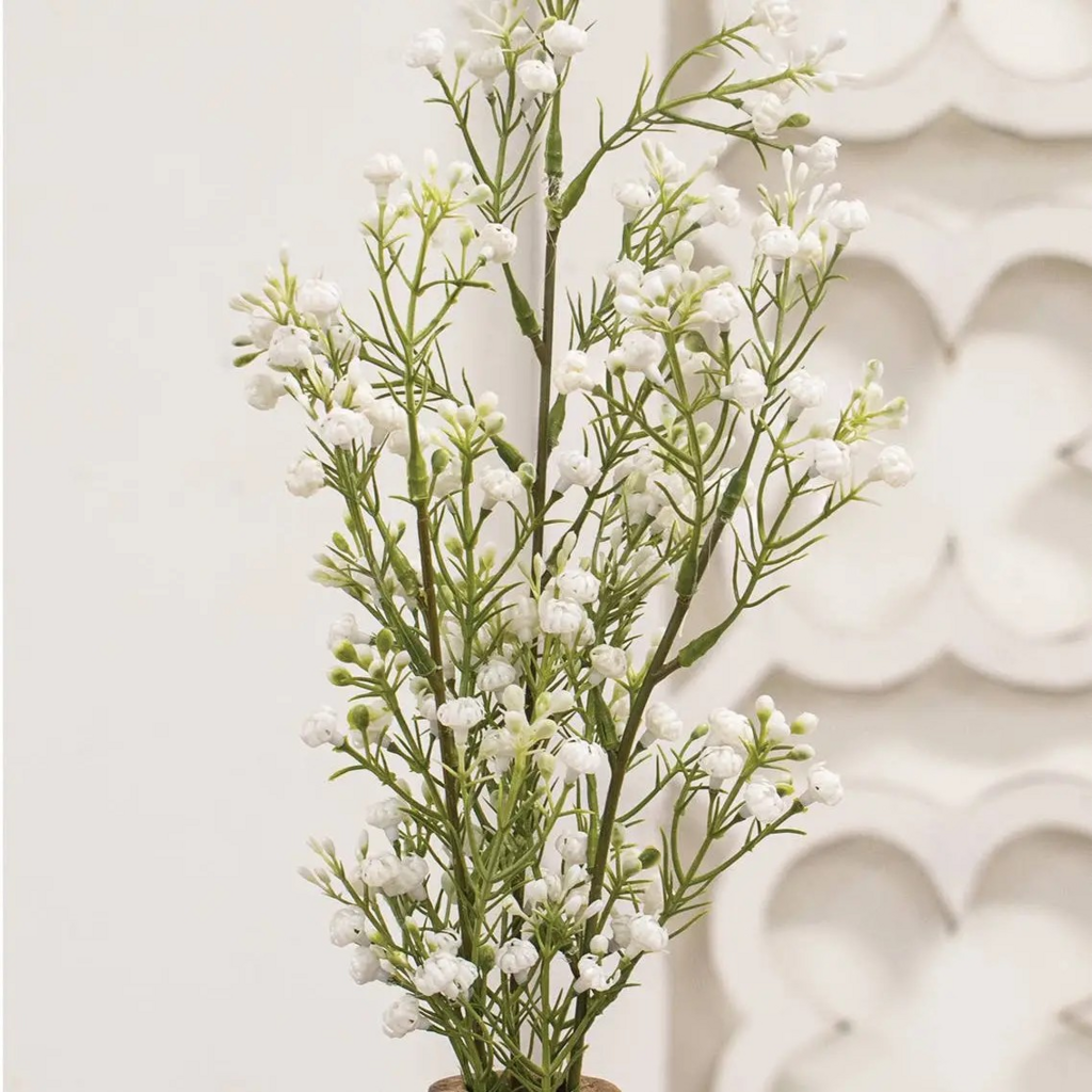 100% realistic- a perfect copy of nature. This drop-in is a no-maintenance work of art. A beautiful stand-alone arrangement, this bundle is wrapped in natural jute twine. A nice addition to desk, kitchen counter or anywhere for a bit of cheer. Color: White. Interior use. Dust with dry cloth. Avoid moisture and direct sunlight.