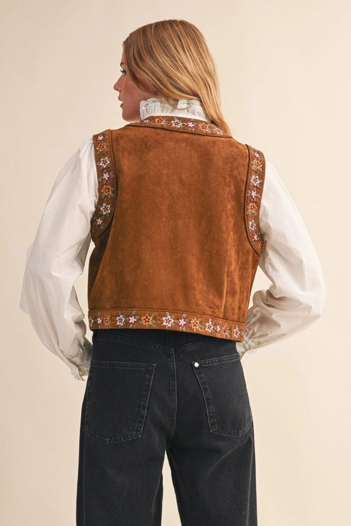 Bring effortless boho style to your wardrobe with this western-inspired quilted jacket. Crafted from a soft cotton-linen blend, it features intricate embroidery, bold contrast piping, and a relaxed, boxy fit with wide sleeves and a slightly cropped length—perfect for layering over dresses, jeans, or sets.