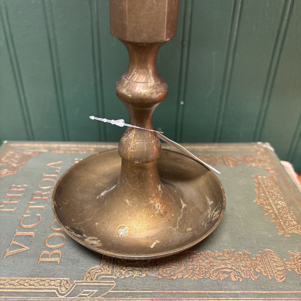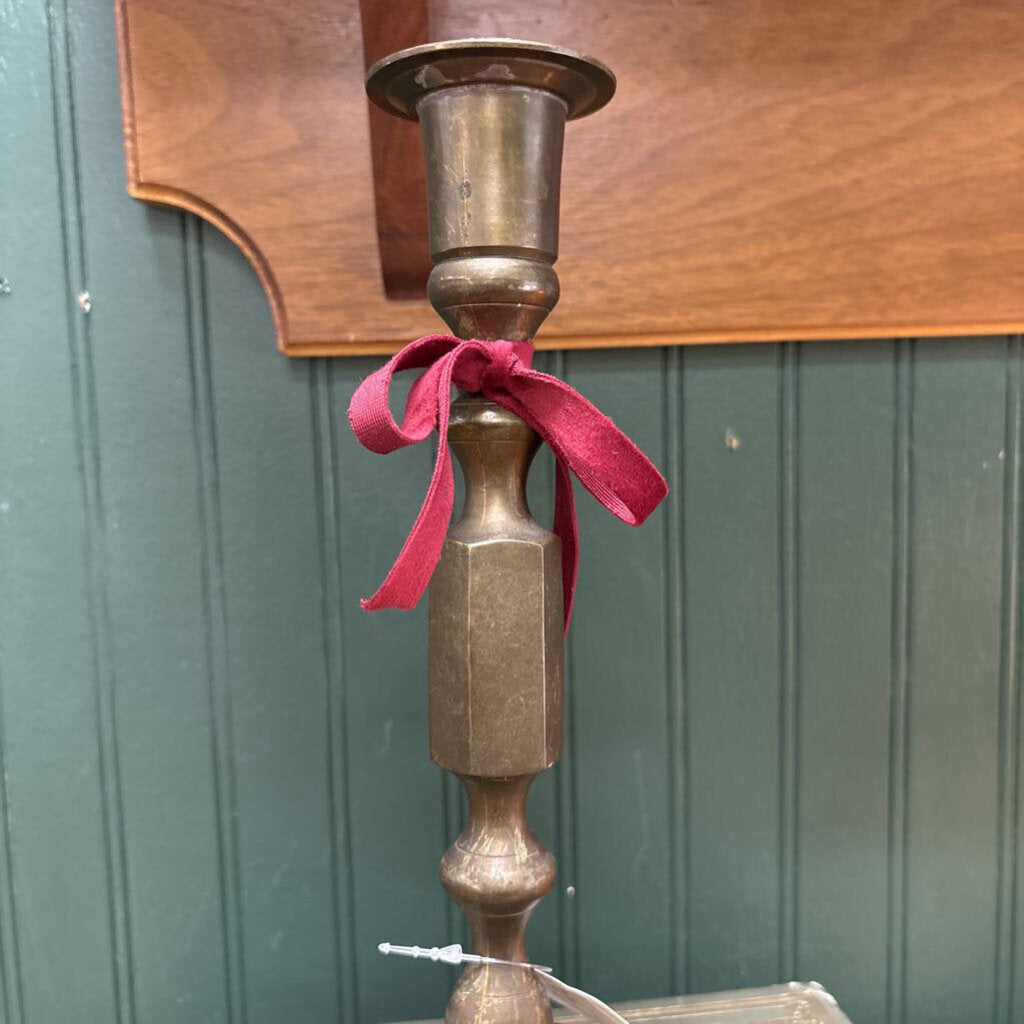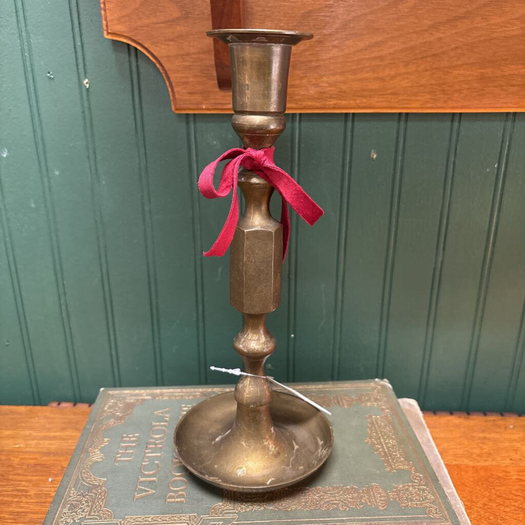 Vintage brass candleholder featuring a triangular base with three claw feet. Holds a standard taper candle. Beautiful warm patina and classic antique style — a great accent for a mantel, shelf, or table.