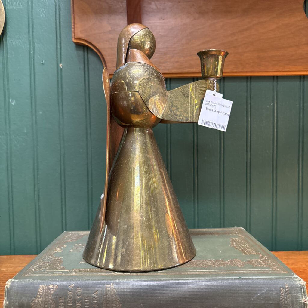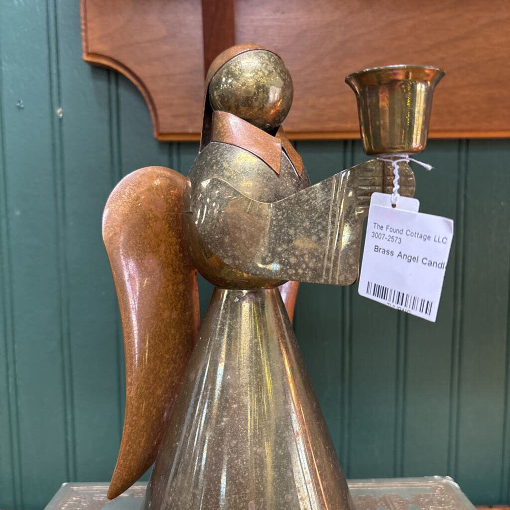 Ornate brass angel candleholder - beautifully detailed and elegantly crafted, this stunning piece adds a heavenly glow to your holiday decor. 4.75" wide by 3.5" deep by 7.75" tall.