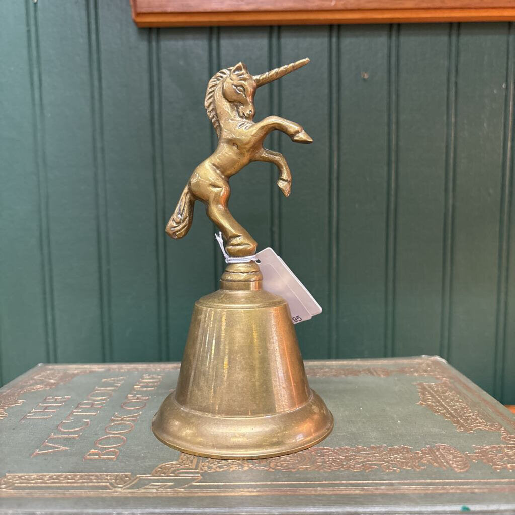 Solid brass unicorn rearing on hind legs. Shiny, bold, and magical. Made in India. 6" long by 2" wide by 4.75" tall.